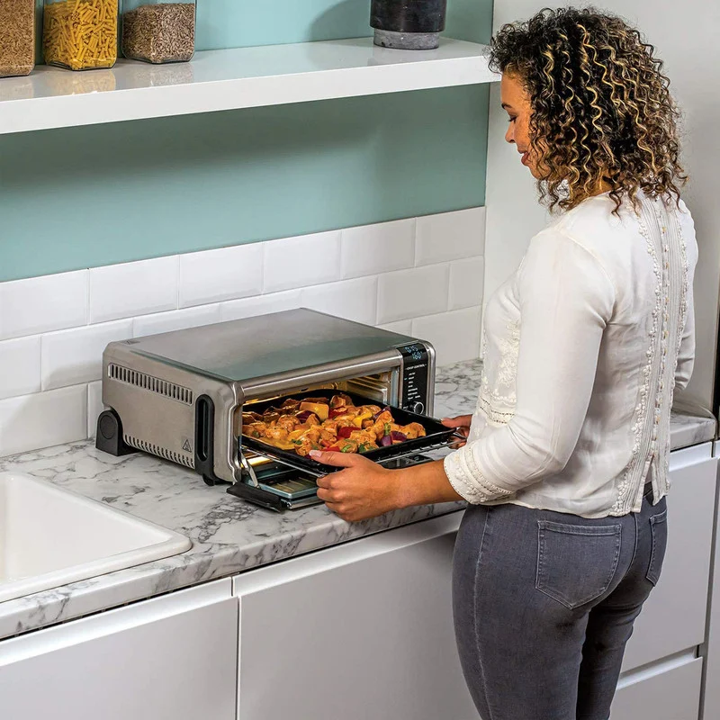 ظرفیت توسط شرکت سازنده به لیتر تعریف نشده و ظرفیت دستگاه ( یک پیتزای 33 سانتی متری، 1 کیلوگرمی سیب زمینی سرخ شده یا 6 تکه نان ) به این صورت توصیف شده / برنامه های پخت Air Fry, Roas