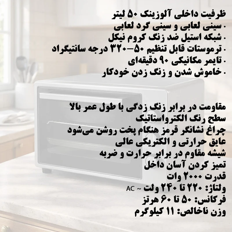 یه فر برقی کاملا کاربردی و مناسب برای مصارف خانگیه، مخصوصا اگه دنبال گزینه ای جمع وجور با قدرت بالا باشی. مشخصات کلی: نوع دستگاه: فر برقی (Electrical Oven) توان مصرفی: 2000 وات قدر